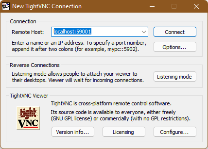 On your local machine (the VNC client), run the following command, replacing <remote user> with your username on the server and <remote host> with the server’s hostname or IP address. You can also change 59001 to a different port if you want, but make the port isn’t already being used by another service and it’s above 1024.